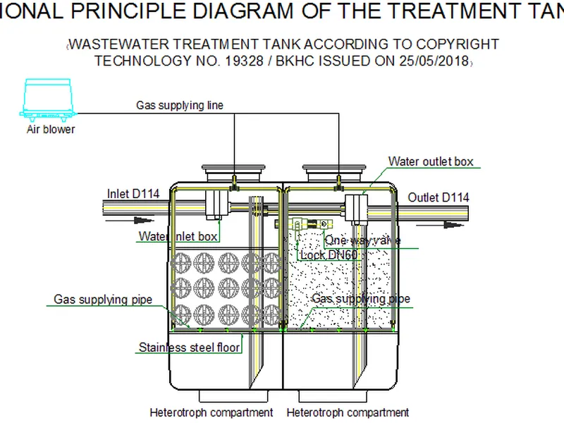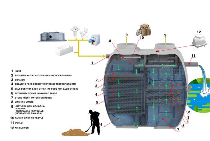 Bể sinh học gồm 2 ngăn chính là ngăn dị dưỡng (01) và Ngăn đầu ra tự dưỡng kết hợp dị dưỡng (02). Trong trường hợp có yêu cầu tái chế, tái sử dụng sẽ có thêm ngăn thứ 3 để dự trữ nước sau xử lý.