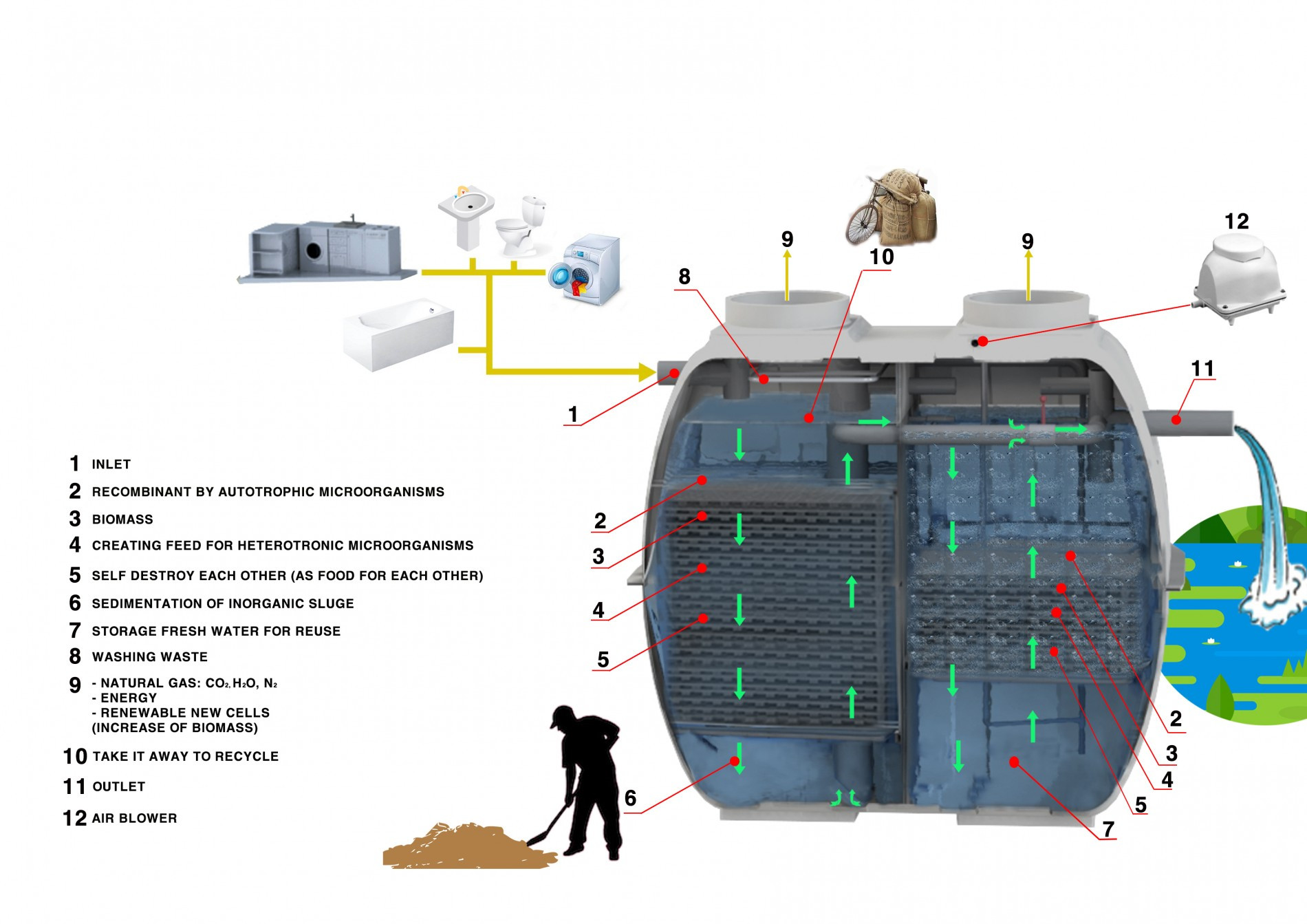 – Ít nhất một thiết bị xử lý nước thải 1 như đã được mô tả ở trên mà hoạt động dựa trên quá trình Sinh huỷ – Tái tổ hợp – Sinh huỷ, trong đó chỉ sử dụng vi sinh tự dưỡng và vi sinh dị dưỡng để tiêu huỷ hoàn toàn các chất thải hữu cơ có trong nước thải;