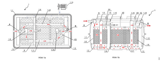 Một ống đứng 1.14 để thu nước từ vùng V5 và tham gia truyền dẫn nước ra khỏi khoang 1.3. Ống 1.14 từ vùng V5 đi xuyên qua các giá thể sinh học tại vùng V4, có đầu dưới thông với vùng V5, đầu trên có độ cao tương tự như đầu trên của ống 1.8. Ống đứng 1.14 này được nối thông với buồng xả B nhờ ống ngang 1.15, ống 1.15 có van một chiều K2 để xả nước sạch đã được xử lý ra ngoài qua buồng trộn B, trong đó van một chiều K2 chỉ cho phép nước chảy theo chiều từ ống đứng 1.14 đến buồng xả B và ngăn không cho dòng nước từ buồng xả B chảy ngược vào khoang 1.3.